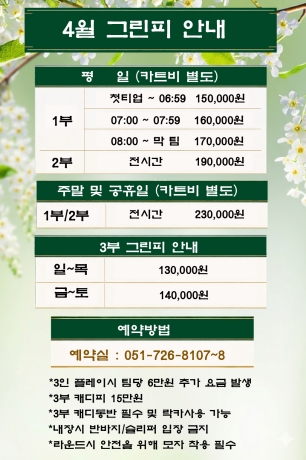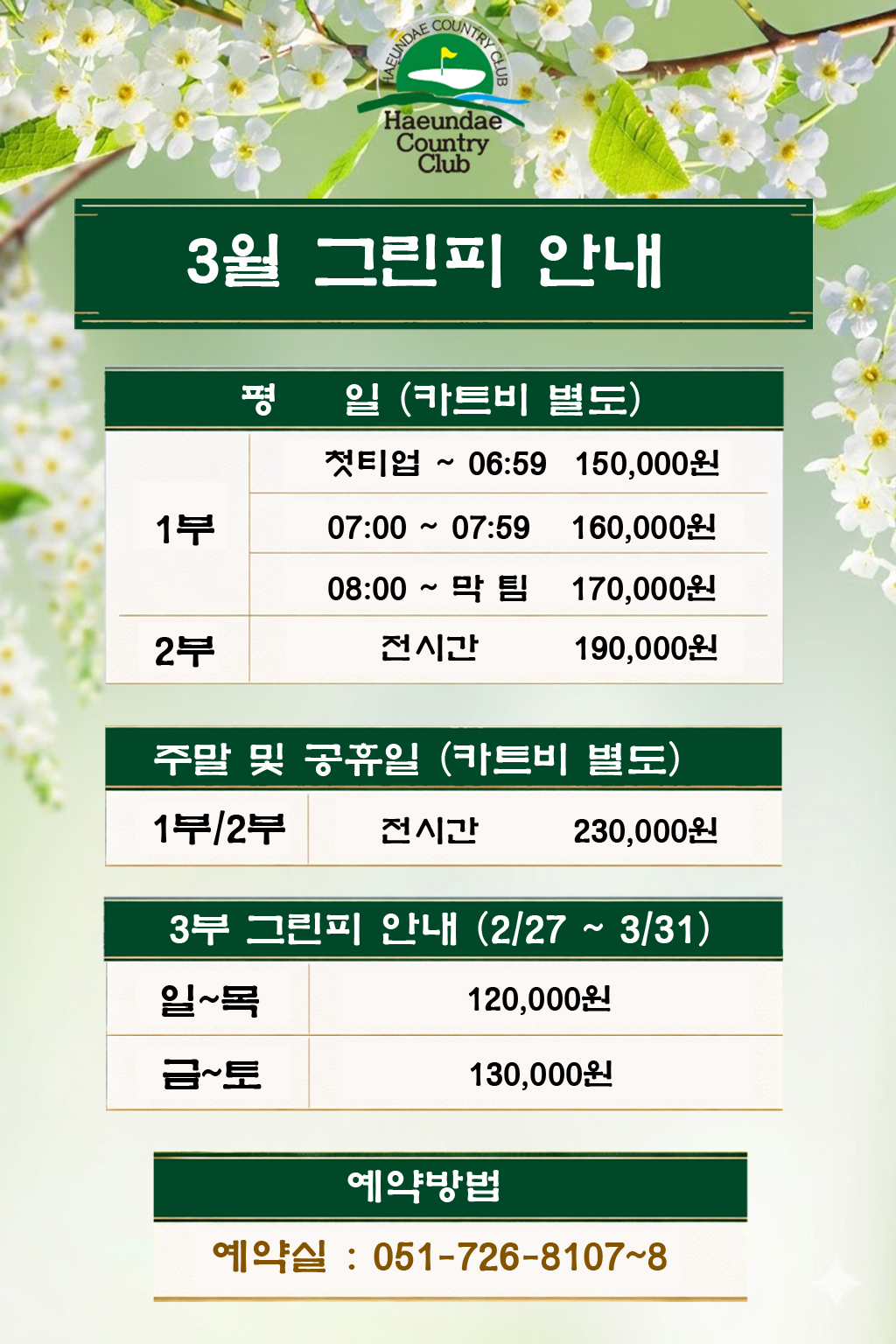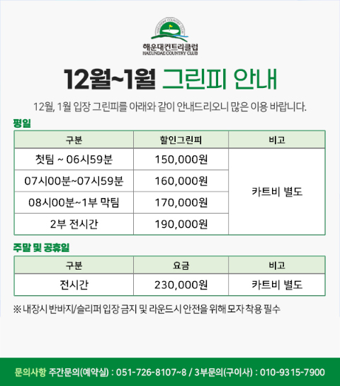 해운대컨트리클럽 부산광역시 기장군 정관면 병산2로 265 대표전화 : 051.726.8000 팩스 : 051.726.8001 사업자등록번호 : 621-81-14504 통신판매업신고 : 2009-부산기장-50